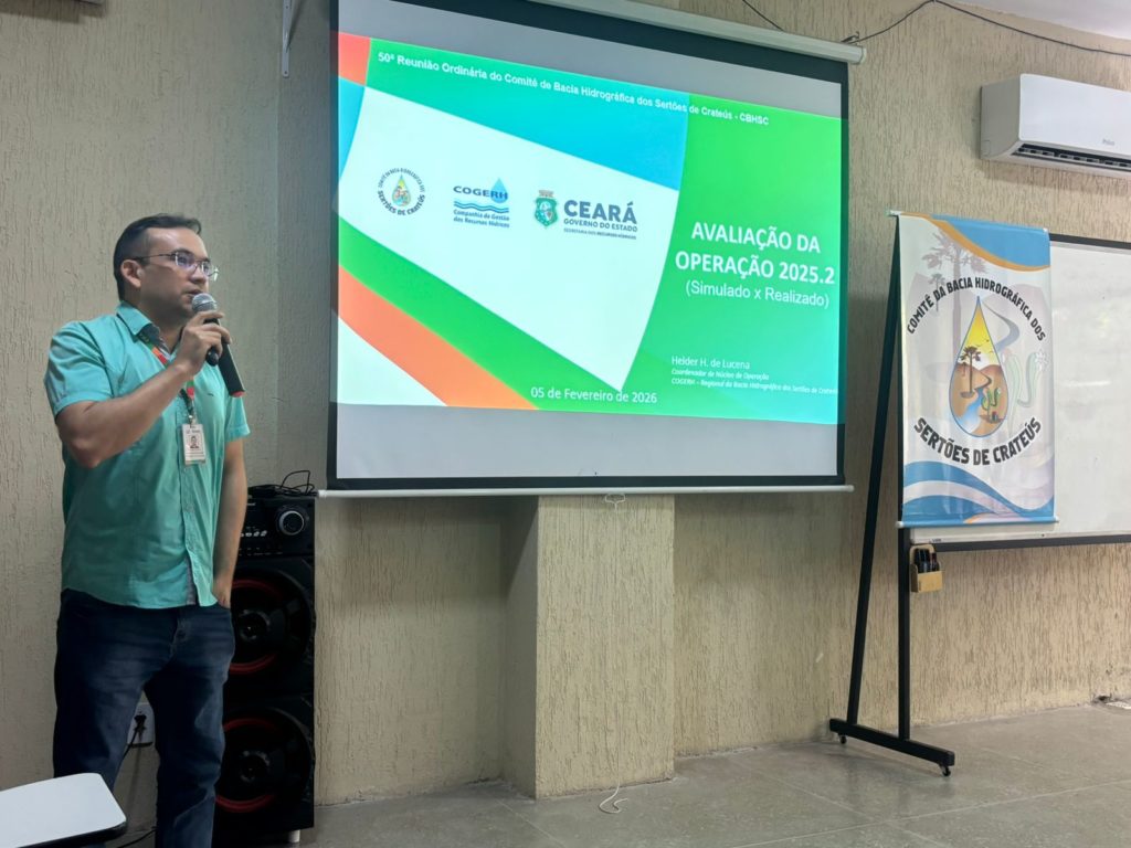 O Comitê da Bacia Hidrográfica dos Sertões de Crateús (CBHSC) realizou, nesta quinta-feira (5), na Cáritas Diocesana, em Crateús, a sua 50ª Reunião Ordinária. O encontro foi o último antes da renovação do plenário do colegiado e reuniu representantes de 21 instituições-membro, equivalente a 70% do Comitê. As principais pautas foram a avaliação das operações de alocação de água 2025.2 dos açudes monitorados e a apreciação do Relatório de Atividades de 2025.